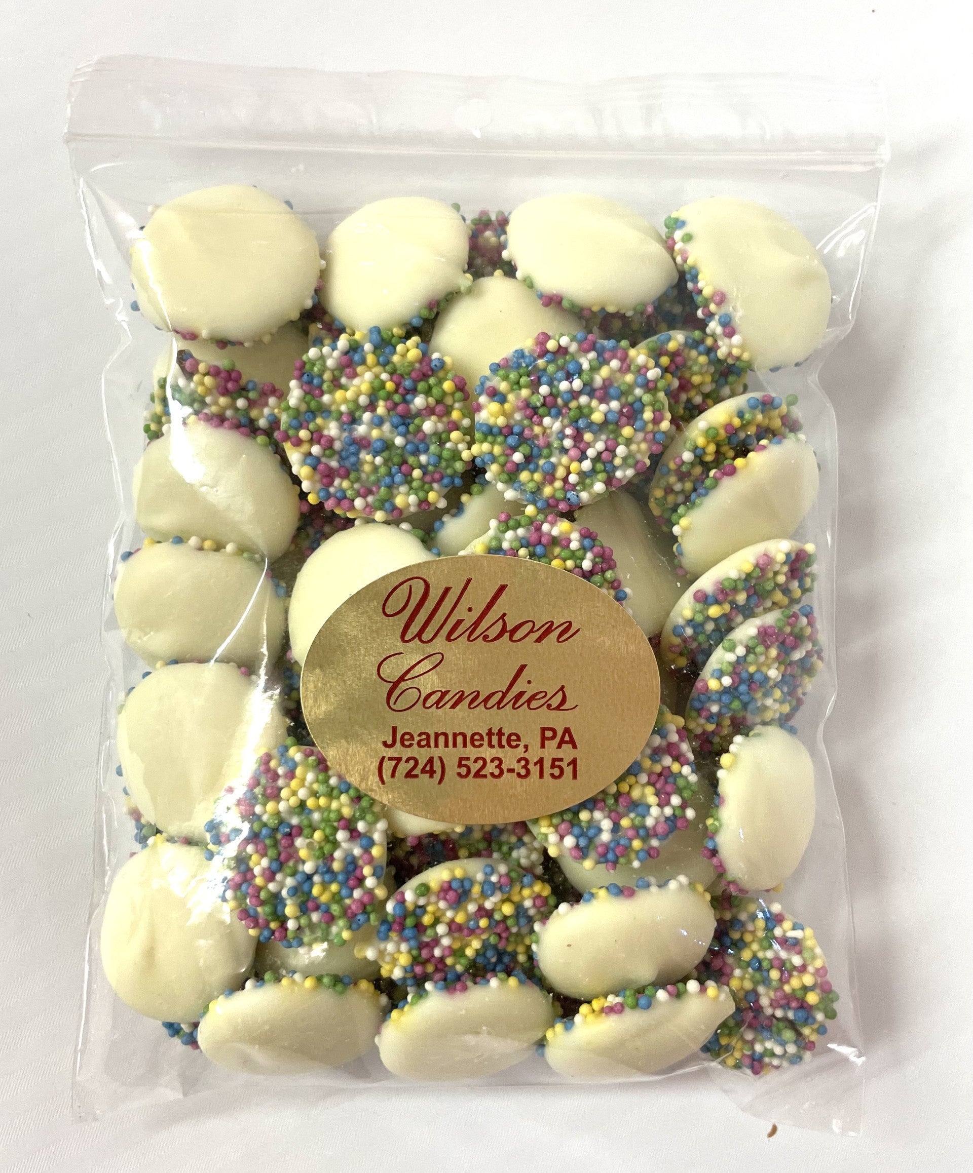 Rich drops of milk, dark, or ivory chocolate topped with pastel colored nonpareil sprinkles.
