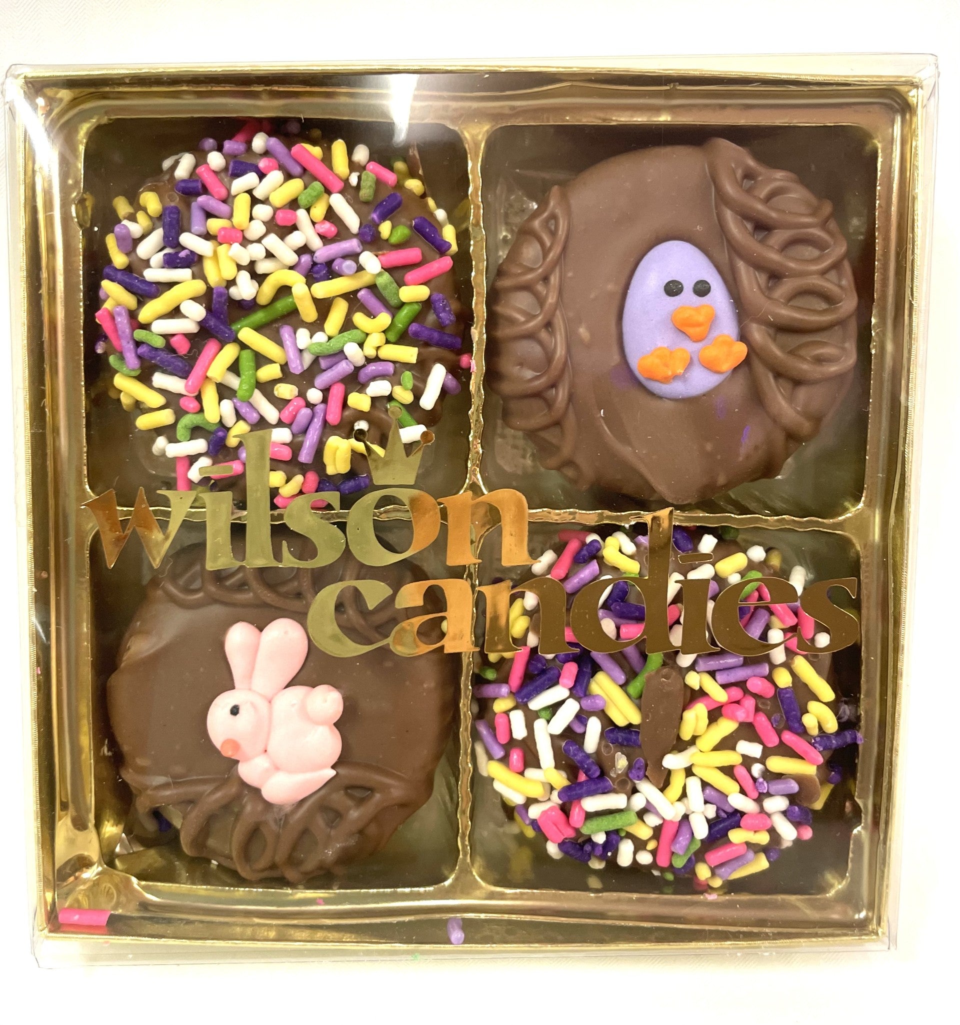 4 milk chocolate covered oreos with seasonal sprinkles and sugar decorations in a gold gift box, perfectly colorful for gifts and parties!